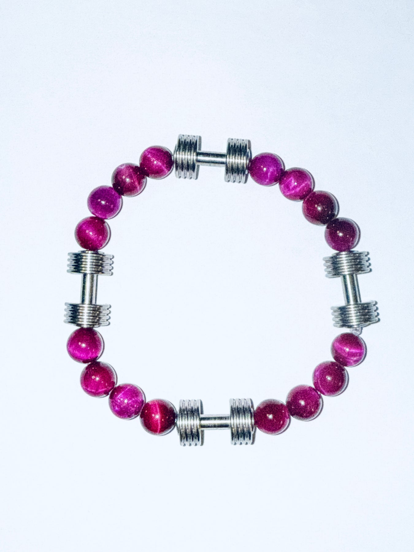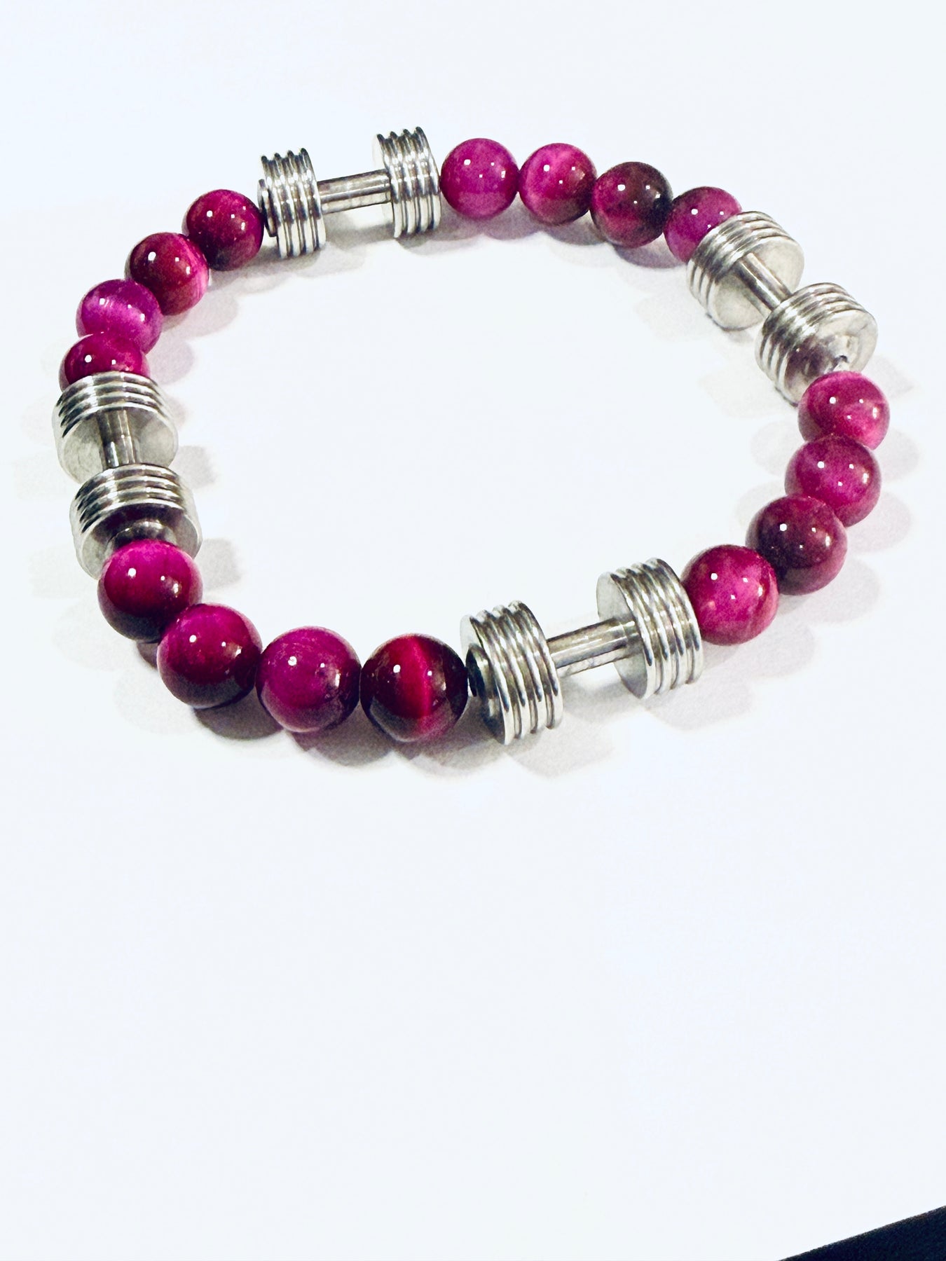 his vibrant bracelet features 8mm Pink Tiger Eye beads—a stone known for confidence and fierce energy. We’ve locked it down with four stainless steel silver dumbbells that shine bright and stand up to the daily grind. Measuring approximately 8 inches, it’s a perfect fit for those who want to flex with style. Strong, colorful, and ready to work